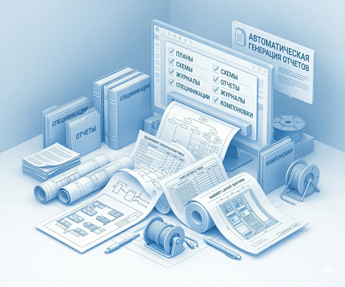 Инструменты программы охватывают ключевые потребности пользователей при генерации всех необходимых проектных документов, включая планы расположения оборудования, спецификацию оборудования, изделий и материалов, структурную схему, отчет по рабочим местам, кабельные журналы, схемы компоновки шкафов