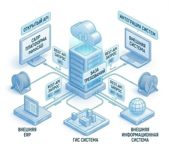 Отрытый интерфейс, реализованный в виде простых REST-API запросов, позволяет включить процесс обсуждения в единый жизненный цикл внутреннего стандарта организации