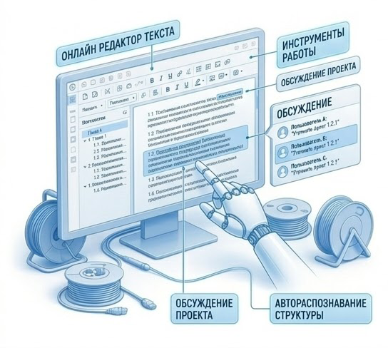 В подсистеме обсуждения проектов реализован онлайн редактор документа со всеми привычными инструментами работы с текстом и автоматическим распознанием структуры
