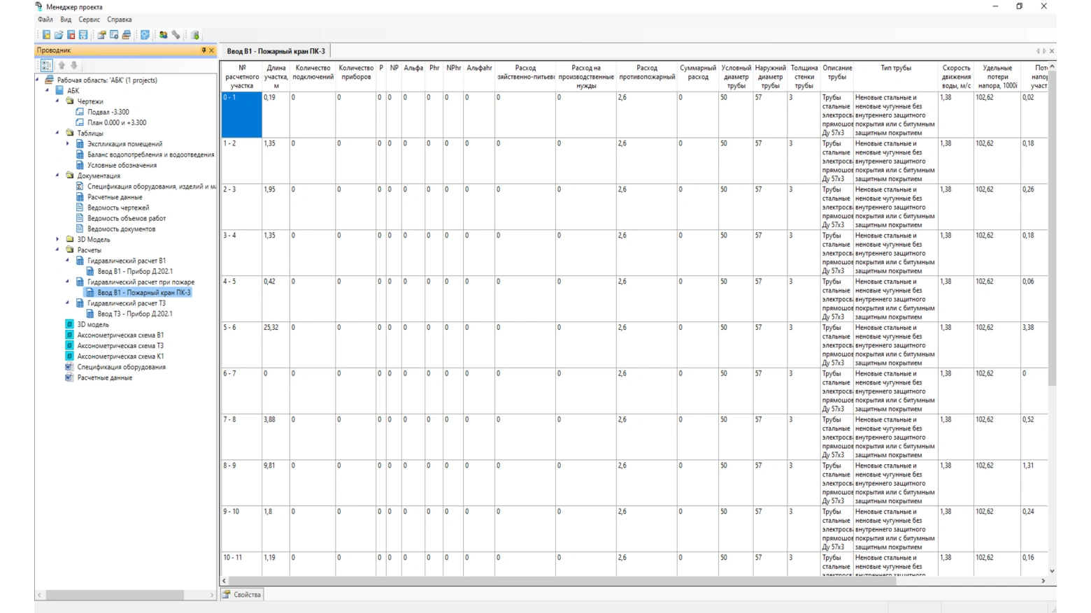 Соответствие требованиям СНиП 2.04.01-85*, СП 30.13330.2012, СП 30.13330.16 и СП 30.13330.2020 как противопожарного водопровода, так и хозяйственно-питьевого с подключенными ПК. Расход воды на пожарные краны определяется по таблице СП 10.13130.2020. Программа самостоятельно подбирает для противопожарного водопровода диаметр и арматуру. Формируется гидравлический отчет