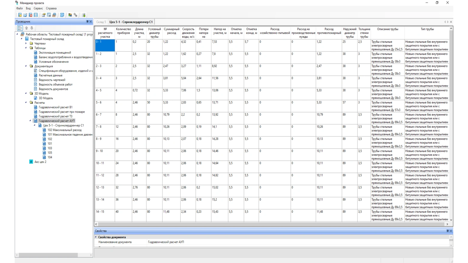 Поддерживается выполнение расчета как по отдельности, так и совмещенного с системой внутреннего противопожарного водопровода согласно СП 485.1311500.2020. Существует возможность настраивать характеристики помещений, характеристики зон пожаротушения, выполнять расчеты тупиковых и кольцевых систем, выводить отчет по спринклерам для каждого помещения