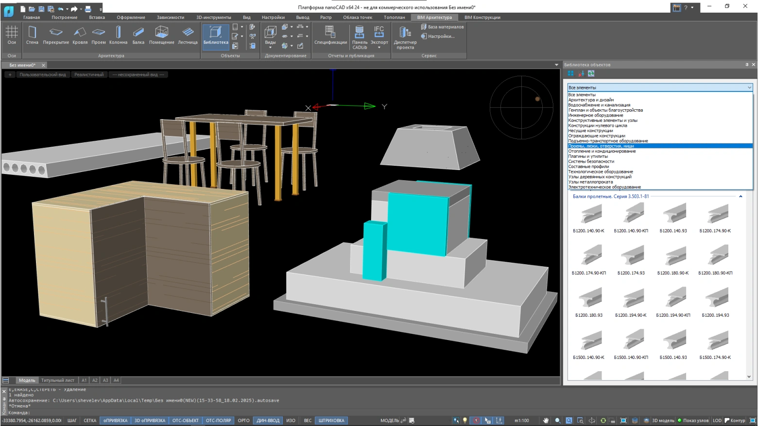 Поддержка *.dwg-формата Прямая поддержка *.dwg-среды позволяет использовать все возможности Платформы nanoCAD для ускорения проектирования, импорта/экспорта данных Инструменты моделирования архитектурной части Разработка архитектурных решений здания с помощью инструментов «Стена», «Перекрытие», «Проем», «Кровля», «Помещение» Инструменты моделирования конструктивной части Создание конструктивных элементов здания с использованием железобетонных и металлических конструкций Диспетчер проекта Удобная навигация по модели с возможностью создания новых видов, фасадов, разрезов, поэтажных планов и др. Инструменты создания пользовательских объектов Создание пользовательских объектов в nanoCAD BIM Строительство возможно различными способами, в том числе с параметризацией Библиотека объектов Встроенная библиотека объектов, включающая множество готовых решений для архитекторов и конструкторов Документирование Получение 2D-документации из информационной 3D-модели с учетом требований к оформлению, а также с динамической связью «3D-модель – чертеж» Специфицирование Создание таблиц из информационной 3D-модели (включая таблицы со сложным форматированием) с учетом российских требований Экспорт данных Экспорт данных в сторонние расчетные комплексы, а также в CADLib Модель и Архив и внешние форматы (IFC, 3D PDF и т.д.) Share
