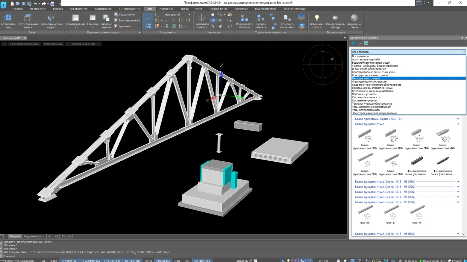 Встроенная библиотека объектов, включающая множество готовых решений для конструкторов: конструкции нулевого цикла, несущие конструкции, закладные изделия, узлы, утилиты армирования