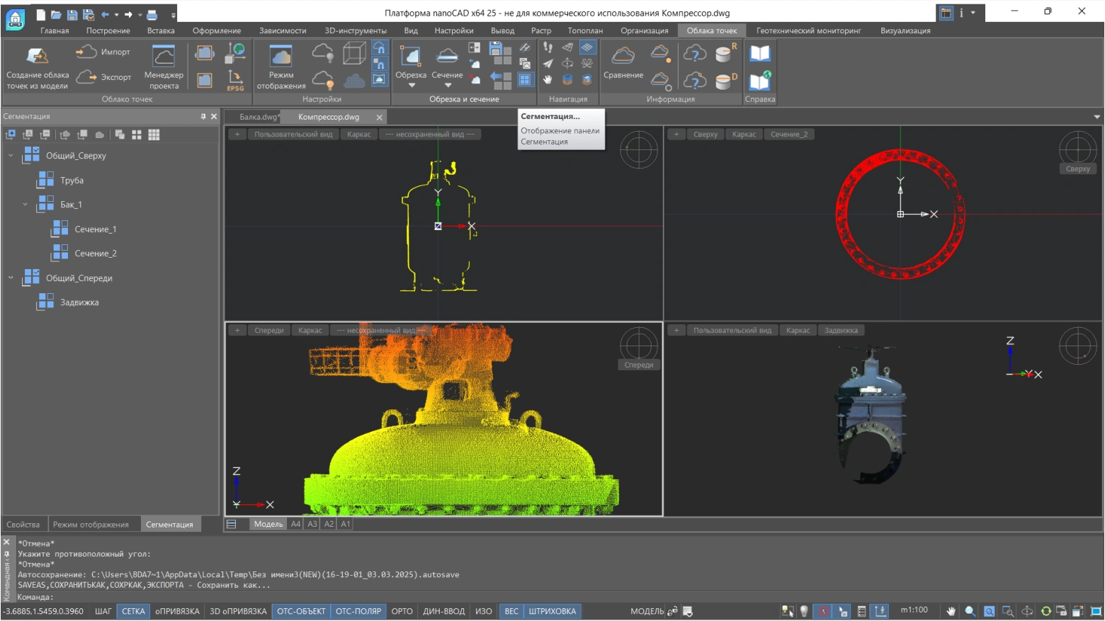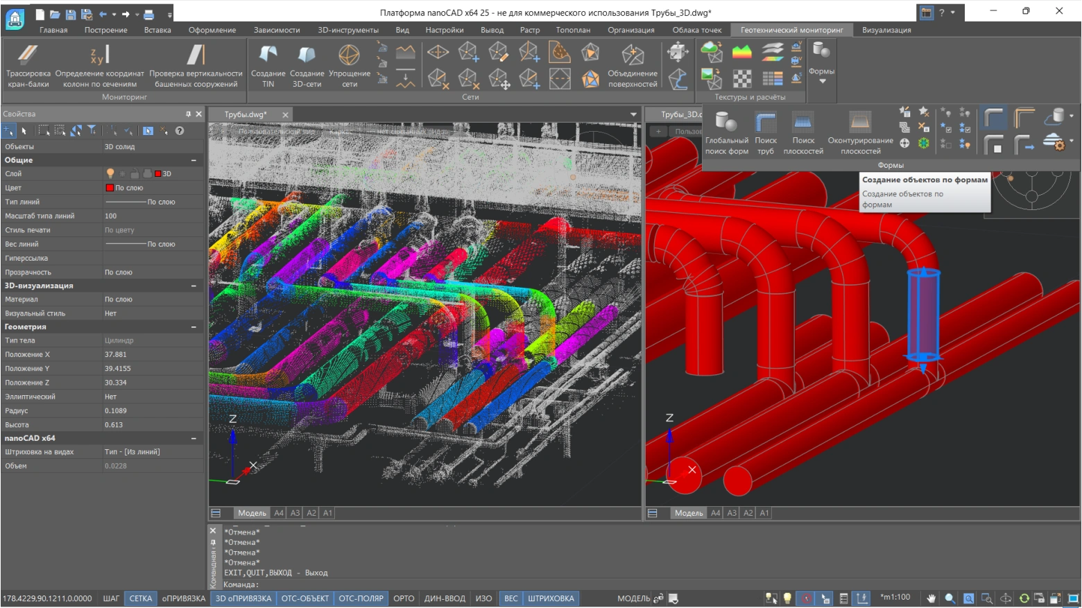 Инструменты для поиска труб и плоскостей в облаке точек на основании заданных параметров с возможностью редактирования распознанных форм и объединения их в сложные агрегатные системы