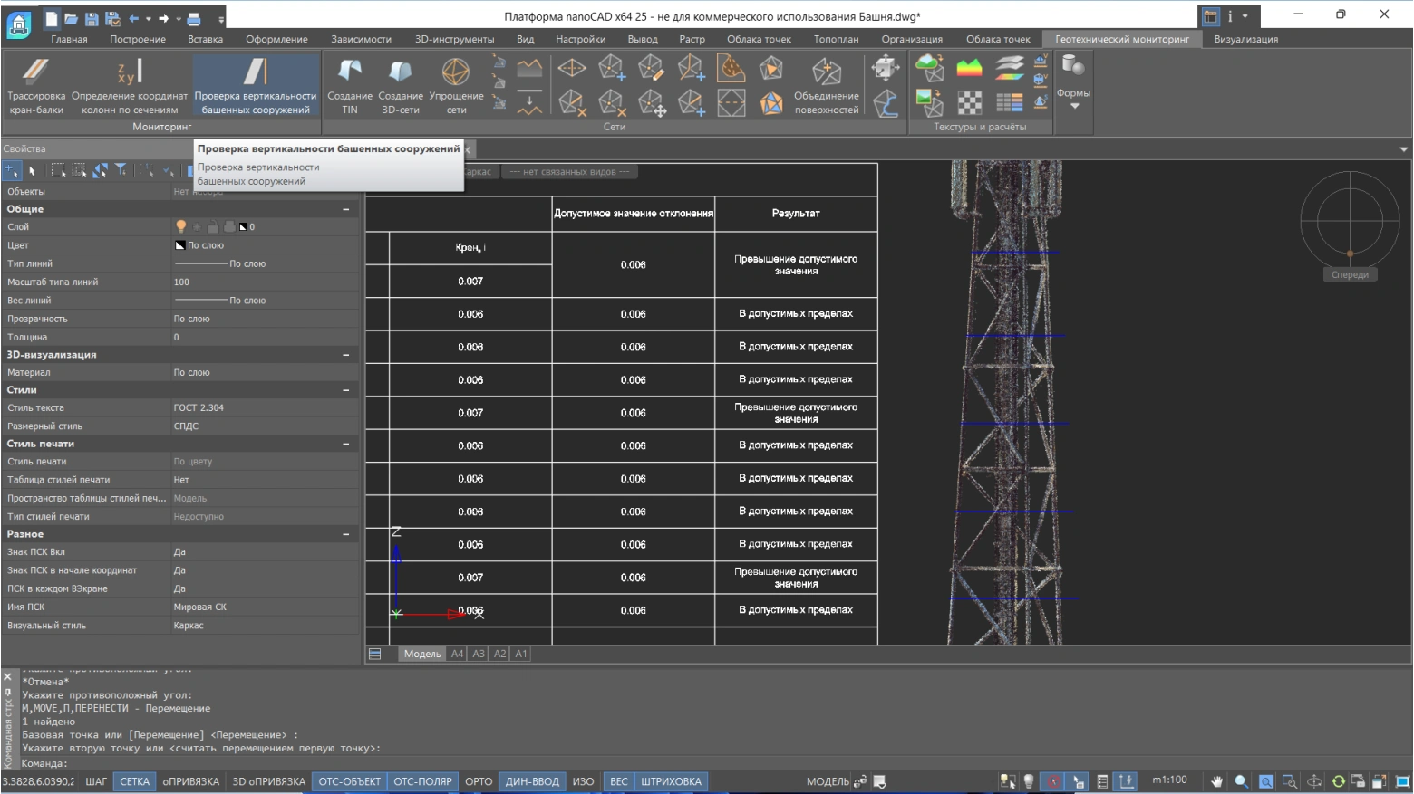 Инструмент для определения величины отклонения сооружений башенного типа от вертикали и основания фундамента. По результатам выполненных расчетов формируется отчет