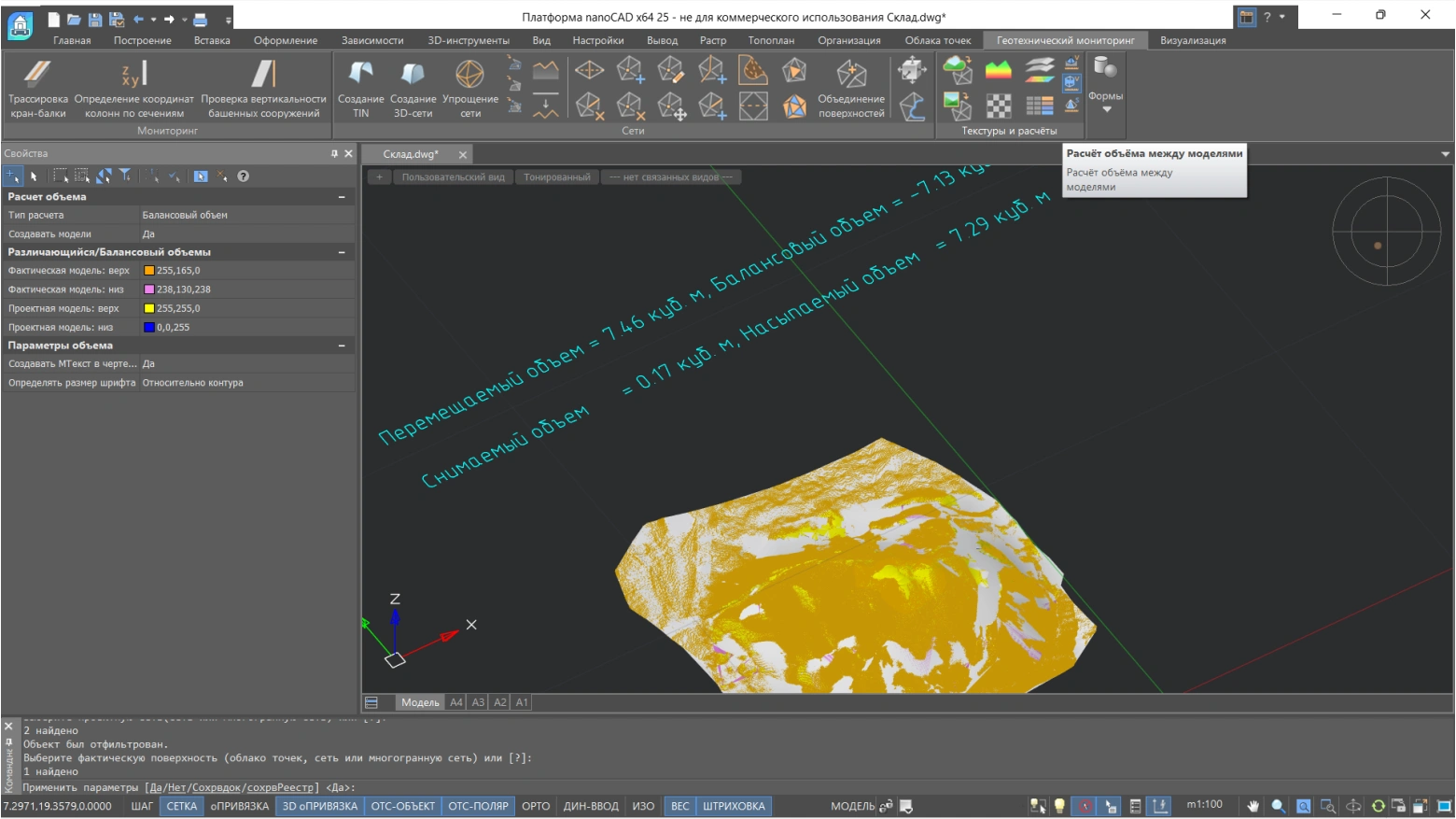 Набор инструментов для расчета объемов между моделью и облаком точек, внутри контура или между моделями. Вычисляется общий, балансовый объем, а также рассчитываются величины снимаемого и насыпаемого объемов