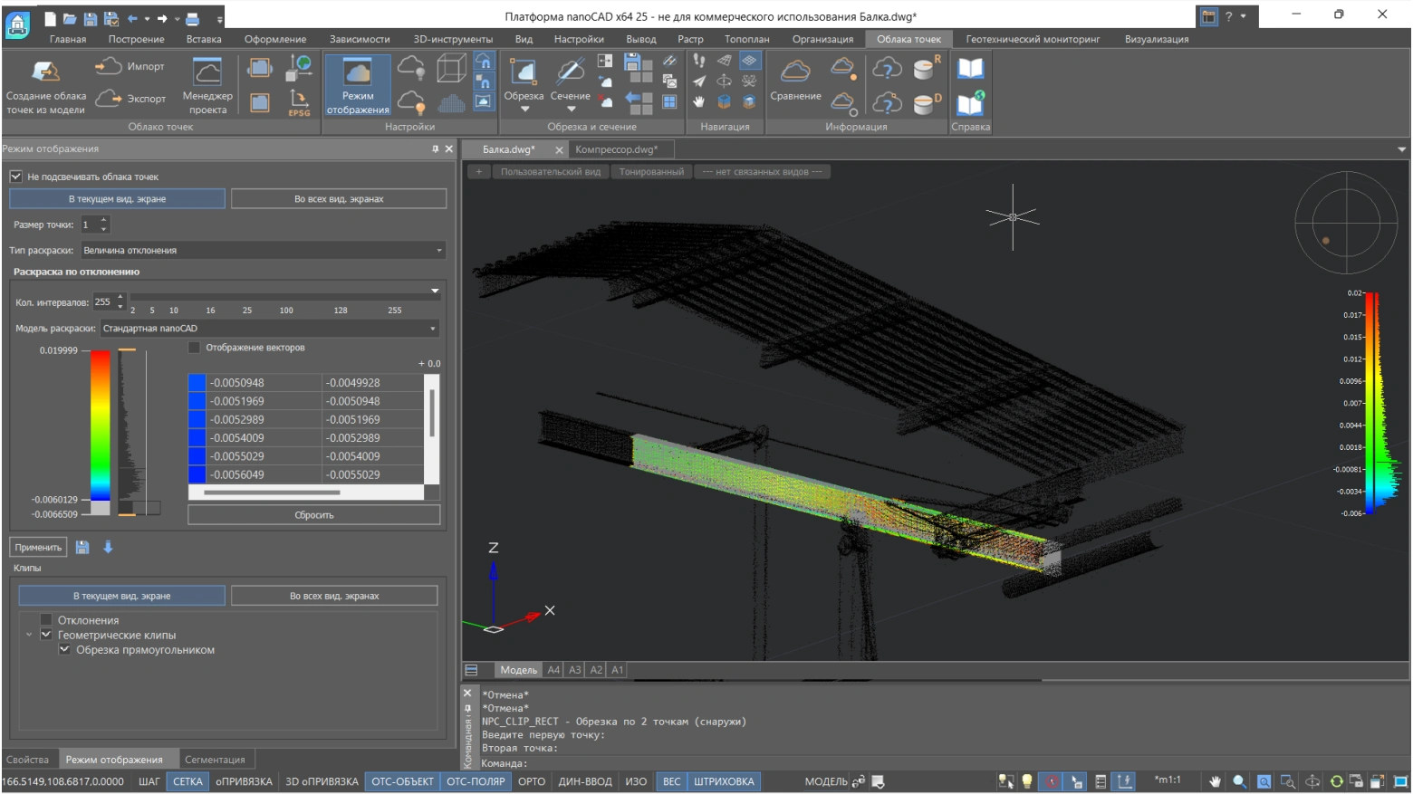 Инструмент определения отклонений между облаком точек и моделью, а также между двумя облаками точек. Позволяет визуализировать полученные результаты с помощью виджета отклонений и настройки дополнительных параметров режима отображения