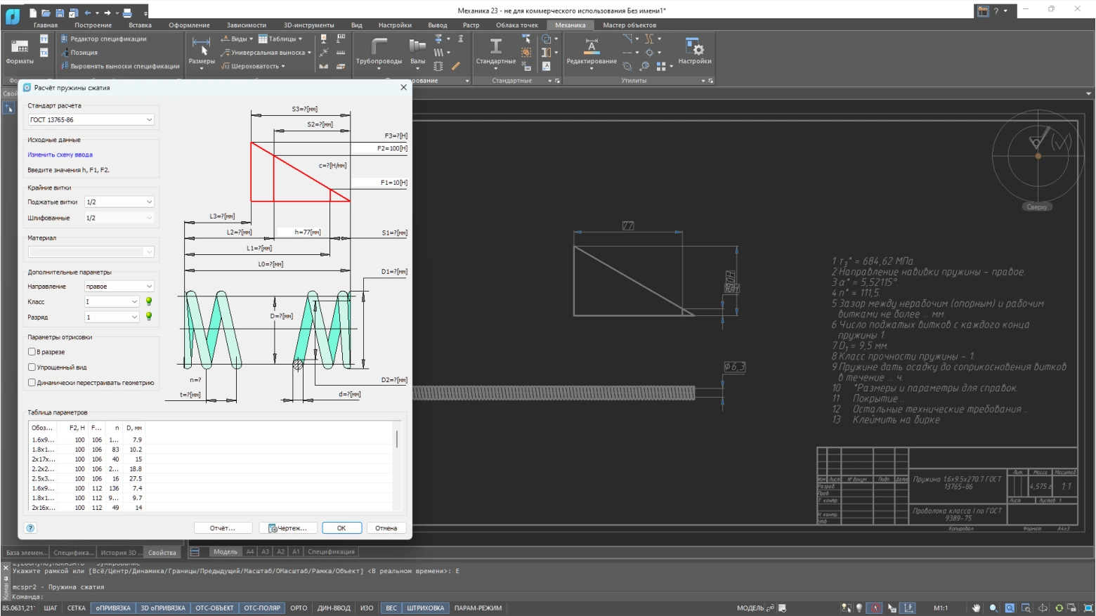 Инструмент, позволяющий рассчитывать пружины сжатия и растяжения. Пользователь может выбрать схему ввода (сила и ход, сила и прогиб или сила и длина) и задать параметры расчета. Модуль поддерживает российские стандарты, включая ГОСТ и ОСТ. После ввода параметров можно выбрать материал и выполнить расчет для создания модели, чертежа или отчета