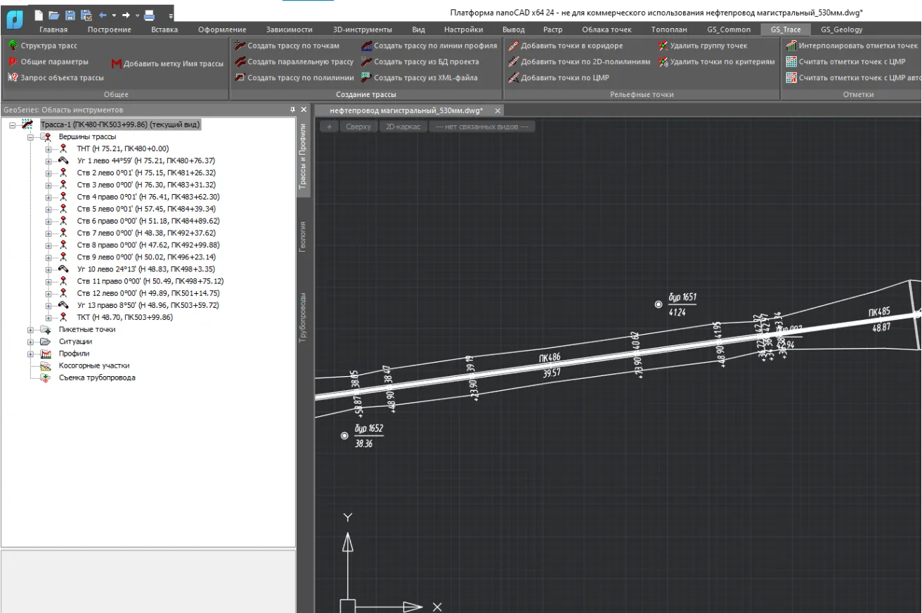 Компонент nanoCAD GeoSeries для выполнения комплекса работ по созданию трасс трубопроводов и других линейных сооружений и построения продольных профилей
